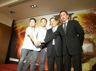 游戲新干線董事長王俊博(右二)取得盛大游戲旗下《MAGIC WORLD II Online》臺、港、澳三地營運權。圖片來源:臺灣“今日新聞網”