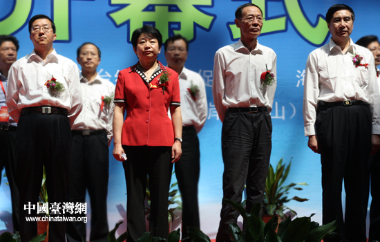 江蘇臺灣周蘇臺(昆山)農(nóng)業(yè)合作洽談會今天在昆山中國國際特許中心開幕。農(nóng)業(yè)部副部長高鴻賓(右二)、臺盟中央副主席黃志賢(右一)、江蘇省副省長黃莉新(前排左二)、國臺辦交流局局長李維一(前排左一)出席開幕式。(中國臺灣網(wǎng) 張弛 攝)