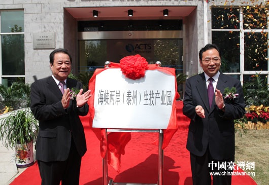 9月19日,“海峽兩岸(泰州)生技產(chǎn)業(yè)園”在江蘇省泰州市“中國醫(yī)藥城”內(nèi)揭牌,臺灣工業(yè)總會(huì)理事長陳武雄(左)出席。(中國臺灣網(wǎng) 鐘寶華 攝)