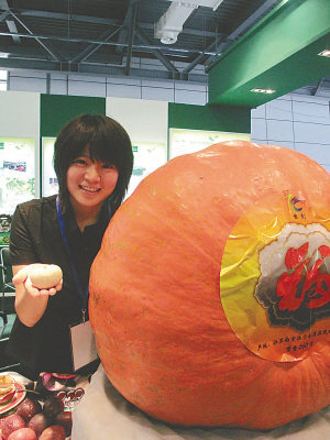 19日,在江蘇臺灣周(昆山)農業合作洽談會上,江寧臺灣農民創業園種出的特大南瓜、特小南瓜令觀者稱奇。
