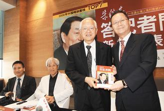 臺灣《經(jīng)濟(jì)日報》出版的《朱镕基答記者問》繁體字版新書發(fā)表會,由臺灣金傳媒執(zhí)行長楊仁烽(右)主持,大陸學(xué)者吳敬璉(左)接受贈書。記者黃義書/攝影