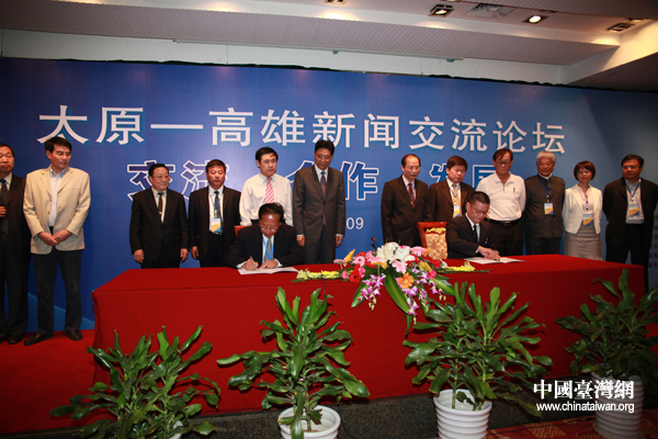 太原市新聞工作者協會主席黃征與高雄市新聞記者公會理事長馬道明共同簽署“四點共識”。 (中國臺灣網 田云鵬 攝)