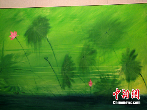 陳歡畫作:風(fēng)中荷花油彩 夏毅 攝