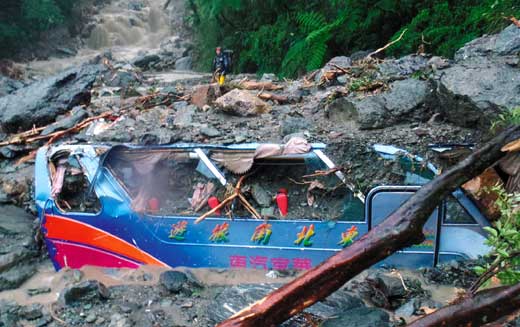 祥華旅行社21日照原定行程安排男子王志中駕駛巴士載著導游范揚堅、10名湖北宜昌與4名貴州旅客,北上將搭22日的班機返鄉,途經東澳與蘇澳間,整輛巴士先遭土石流推擠到懸崖邊,幸大陸領隊馬仕華率大伙合力破窗,死里逃生。