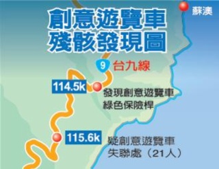 蘇花公路發現疑似失蹤大陸游客所乘游覽車前方保險桿、插著鑰匙的油箱蓋、小孩洋裝和防火板。 來源:臺灣TVBS電視臺