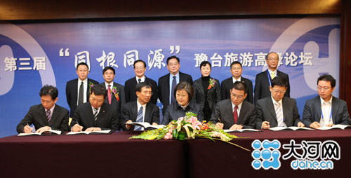 會議期間河南省旅游局分別與臺灣多家旅行社簽訂戰略合作協議,就相關豫臺旅游合作事宜達成共識。據悉,活動期間還將在新鄭舉行“同根同源?共拜先祖”活動,并組織與會者參觀考察河南各地市的旅游市場。