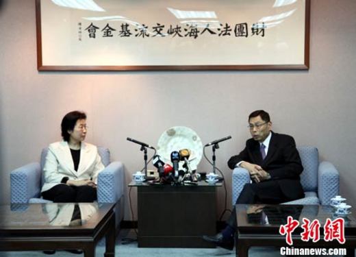 10月27日,大陸海協會副秘書長張勝林等抵達臺灣,了解在臺灣蘇花公路失蹤的20名大陸同胞的搜救進展情況。圖為張勝林(左)下午會見海基會副董事長高孔廉。中新社記者 陳立宇 攝