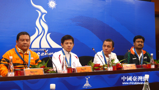 中華臺北隊臺球隊選手郭柏成(左二)在賽后出席新聞發布會接受記者采訪(中國臺灣網 李徽 攝)