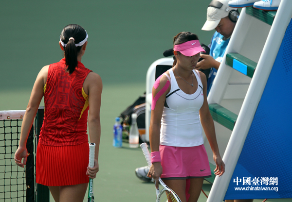 16日上午,第十六屆廣州亞運會女子網球團體賽決賽正在進行,中國隊與中華臺北隊爭奪冠軍。首場單打由中國隊選手彭帥對陣中華臺北隊選手張凱貞。身著紅色隊服者為彭帥。(中國臺灣網 鐘寶華 攝)