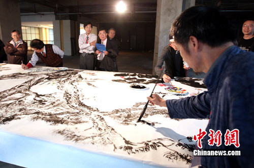 兩岸畫家18日繪制的畫作為百米長卷的其中一部分。20日上午,這幅8米長的畫作將與其余已完成的部分連成百米長卷向重慶市民進行展示。屆時,約20名兩岸畫家將在現場完成最后的點睛之筆。