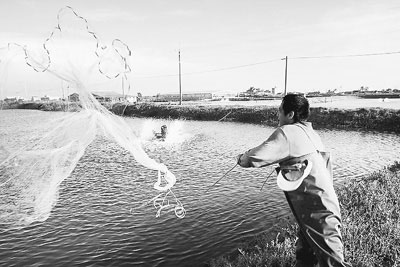 臺灣漁民撒網(wǎng)捕撈虱目魚。