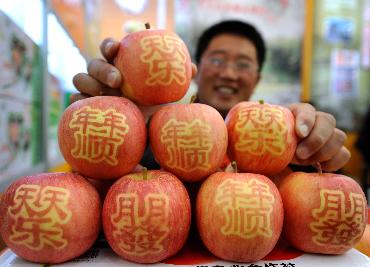 12月3日,江蘇豐縣喜來樂果蔬專業(yè)合作社人員在展銷會(huì)上展示特色禮品蘋果。