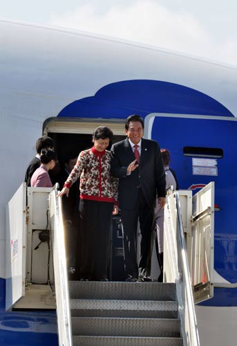 20日中午陳云林搭機(jī)抵達(dá)桃園機(jī)場(chǎng)。他向守候媒體及接機(jī)人員揮手。海峽交流基金會(huì)副董事長(zhǎng)高孔廉等人前往接機(jī),現(xiàn)場(chǎng)并有大批媒體守候。 “中央社”圖