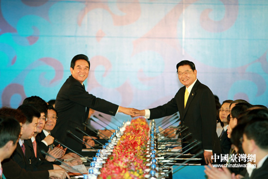 12月21日上午9時,兩岸兩會領(lǐng)導(dǎo)人第六次會談在臺北圓山飯店舉行,海協(xié)會會長陳云林與海基會董事長江丙坤在臺北再度握手。(中國臺灣網(wǎng) 鐘寶華 攝)