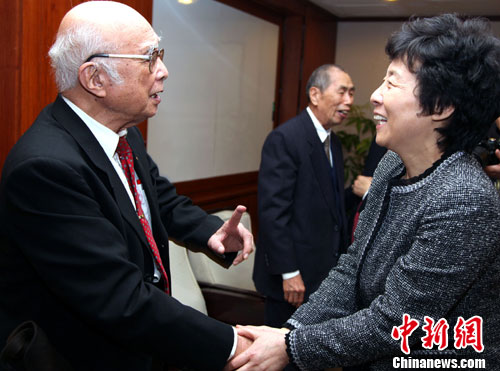 嚴雋琪13日在臺北圓山大飯店會見8位在臺原福建省立農學院首屆校友。中新社記者 關向東 攝