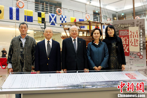 12月22日,“福建船政——清末自強運動的先驅”特展在臺北開幕。70多件文物及展品和百余幀珍貴圖片,展現中國近代奮發圖強,尤其是船政沿革和海軍建設等的成就和歷程。圖為福建船政創辦者沈葆楨后人沈呂遂、臺灣前海軍總司令葉昌桐、長榮集團副總裁林省三、福州政協副主席陳今明(左起)等為特展開幕剪彩后合影。 中新網發 黃少華 攝