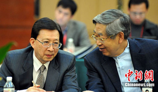 1月18日,第九屆兩岸關系研討會在廣西桂林開幕。會上,中華文化發展促進會會長許嘉璐與臺灣中華文化總會會長劉兆玄親切交流。中新社記者 蔣雪林 攝