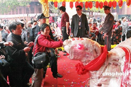 資料圖:二零零八年二月二十二日,福建泉州天后宮舉行熱鬧的傳統(tǒng)民俗“平安乞龜”活動吸引大批市民。十噸袋裝大米制成的“乞龜”長7米,寬近5米,撫摸其頭頂則有平安祝福的美好寓意。 中新社發(fā) 傅丹丹 攝
