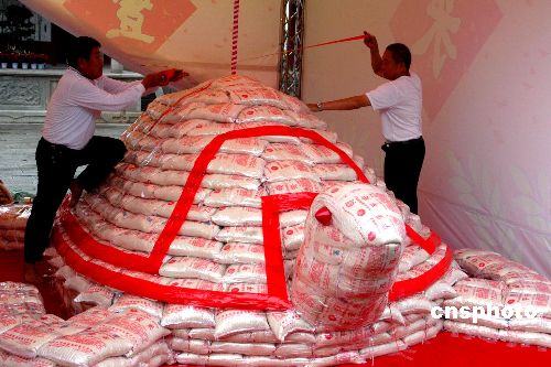 資料圖:二零零七年三月一日,在泉州天后宮廣場內(nèi),兩位來自臺灣澎湖縣的“米龜”制作師傅正在為“米龜”做最后的修繕工作。這只“米龜”共由一千兩百袋、六千公斤平安米筑成,屆時,澎湖“乞龜”祈福的民俗表演將首次在泉州展現(xiàn)。 中新社發(fā) 傅丹丹 攝