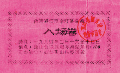 我喜歡收藏各種類型的門券,在收藏的形形色色門券中,有一張最為特別、簡單和罕見。這就是27年前,也就是1984年元宵節(jié)福建省東山島舉行的臺灣海峽兩岸燈謎會猜入場券。看到這張粉紅色的特殊入場券,我的記憶又回到當年氣氛熱烈的燈謎猜射場景中。