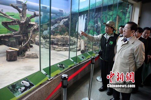 2月19日,以中國野生動物保護協會名譽會長身份首度訪臺的國家林業局局長賈治邦,冒雨來到臺北市立動物園,看望了大陸贈臺大熊貓“團團”、“圓圓”,了解其最新生活狀況,希望促進兩岸野生動物保護等交流與合作。圖為賈治邦在大熊貓館隔著玻璃墻仔細觀看“團團”、“圓圓”的一舉一動。 董會峰 攝