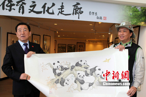 圖為參觀完畢,賈治邦(左)向臺北市立動物園園長葉杰生贈送大陸畫家的熊貓畫作。 董會峰 攝