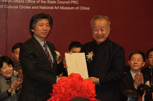 中國美術館館長范迪安(左)向劉國松頒發證書(中國臺灣網 于斯文 攝)