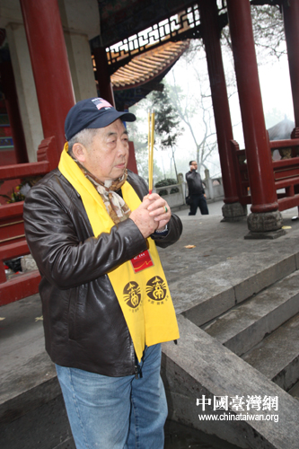 在工作人員的協(xié)助下,81歲的魯燦云老先生從陵園入口一路跋涉至炎帝陵前,虔誠(chéng)為始祖敬香。(中國(guó)臺(tái)灣網(wǎng) 楊麗 攝)