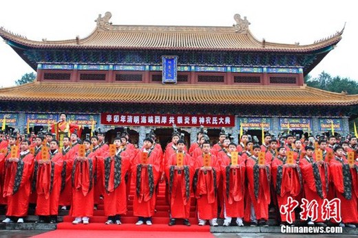 “辛卯年清明海峽兩岸共祭炎帝神農(nóng)氏大典”4月3日在中華始祖炎帝安寢地湖南株洲炎帝陵舉行,參加第二屆“在臺湘籍后裔湖南行”活動的臺灣鄉(xiāng)親及社會各界人士共200多人祭拜炎帝神農(nóng)氏。圖為千人頌唱《祭炎帝》。中新社發(fā) 劉柱 攝