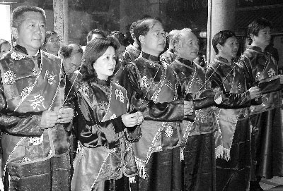 9日,李沃士(左三)和夫人蘇鳳英(左二)在湄洲媽祖祖廟向媽祖金身進(jìn)香