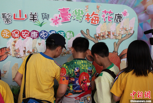 4月7日,臺(tái)北市立動(dòng)物園為臺(tái)灣同胞回贈(zèng)大陸同胞的長鬃山羊(“喜羊羊”和“樂羊羊”)和梅花鹿(“繁星”和“點(diǎn)點(diǎn)”)舉行祈福活動(dòng),它們即將在16日啟程赴山東劉公島。這場名為“永保安康——為長鬃山羊與梅花鹿祈福”的活動(dòng)吸引了近百名幼兒園小朋友和小學(xué)生參加。圖為小朋友們把祝福卡片貼在祝福版上。路梅 攝