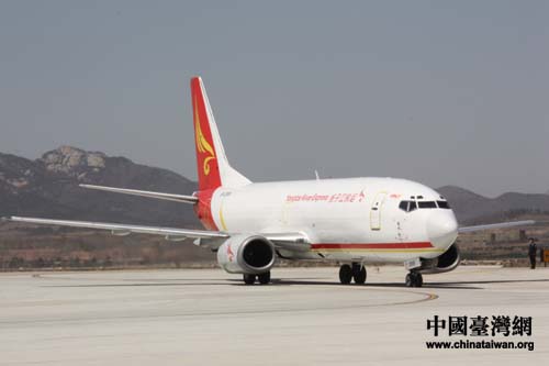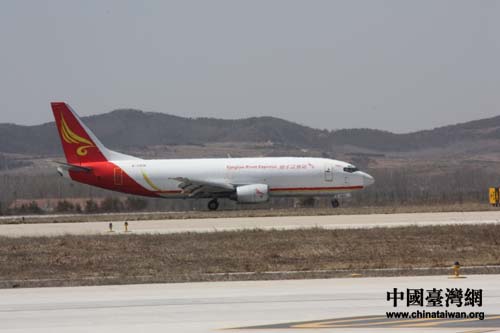“繁星”、“點點”、“喜羊羊”、“樂羊羊”順利抵達威海機場。圖為飛機著陸后滑行。(中國臺灣網 劉海偉 攝)