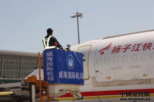 “繁星”、“點點”、“喜羊羊”、“樂羊羊”順利抵達威海機場。圖為機場地勤人員準備接“寶貝”們下飛機。(中國臺灣網 劉海偉 攝)