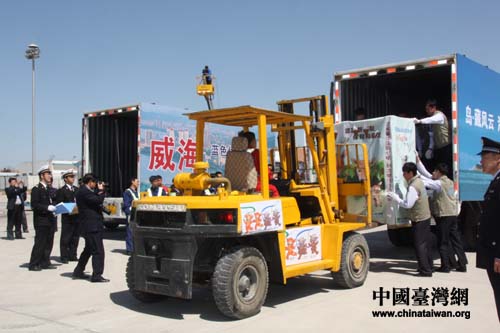 下午14點20分,迎接臺灣贈大陸梅花鹿和長鬃山羊的車隊從機場返回威海市,車隊到達劉公島外旅游碼頭后,兩輛動物運輸車駛上登陸艦,相關人員乘旅游船,隨后,負責引導的海事船和登陸艦、旅游船組成船艦編隊駛向劉公島。