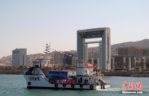 臺灣梅花鹿和長鬃山羊16日抵達威海機場,隨即經緊湊的陸地、海上運輸登上劉公島。圖為專門搭載兩對“寶貝”的登陸船行進在威海灣。劉舒凌 攝