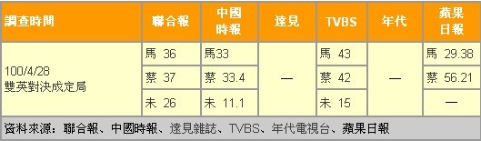 2012年臺灣大選“雙英”對決成局后,臺灣各家媒體都做了最新選情民調,《聯合報》調查結果,雙英呈現五五波局面,但是臺灣《蘋果日報》調查結果,蔡英文支持度大幅領先馬英九。圖片來源:臺灣《聯合報》