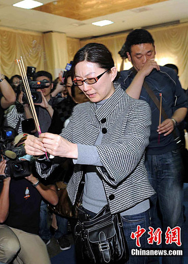 首批阿里山小火車意外事件死者家屬,29日早上到殯儀館認尸。徐熙芬家屬難掩內心哀傷激動痛哭,在靈堂上香。中新社發 譚達明 攝