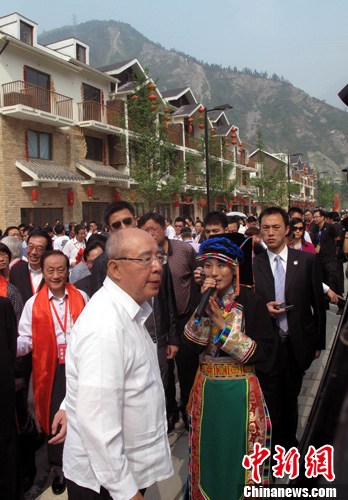 5月6日,吳伯雄與即將出席第七屆兩岸經(jīng)貿(mào)文化論壇的臺(tái)灣嘉賓參訪了汶川縣映秀鎮(zhèn)、水磨鎮(zhèn),都江堰市愛心家園、離堆公園等地震受災(zāi)地區(qū)。圖為吳伯雄聽取當(dāng)?shù)鼐用窠榻B重建進(jìn)展。中新社發(fā) 劉舒凌 攝