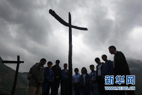 資料圖片:5月9日,在“5.12”汶川地震重災(zāi)區(qū)四川省青川縣東河口地震遺址公園,在青川參加災(zāi)民安置房援建工作的香港迪士尼樂(lè)園的志愿者在雨中默哀。 新華社記者 任正來(lái) 攝