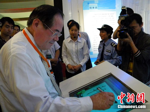 在參觀江陰成就館時,看著描繪江陰城鎮新面貌的一幅幅照片,多次來過此地的臺灣鄉鎮市區長聯誼會主席李乾龍在電子簽名屏前,欣然題寫“幸福城市”。中新網發 唐娟 攝