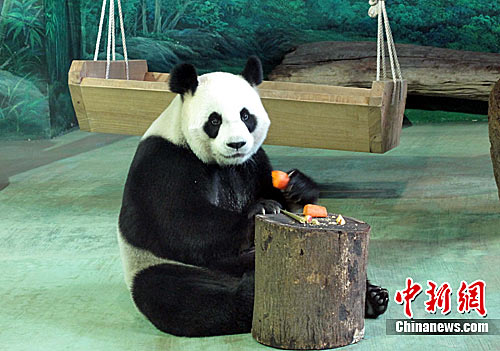 圖為圓圓17日下午進(jìn)食胡蘿卜。中新社發(fā) 路梅 攝