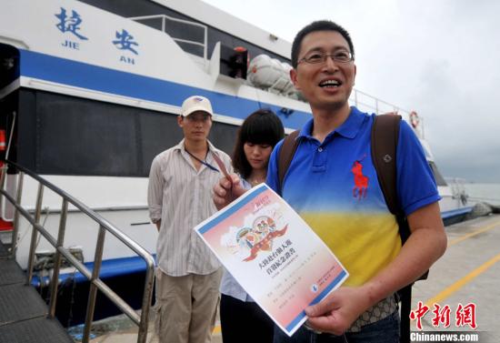 圖為廈門首發(fā)團(tuán)游客登船前展示島內(nèi)旅游部門頒發(fā)的首發(fā)紀(jì)念證書。中新社發(fā) 王東明 攝