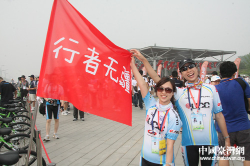 “行者無疆 綠色騎行”,兩名臺灣青年在活動中留影紀(jì)念。(中國臺灣網(wǎng) 于斯文 攝)