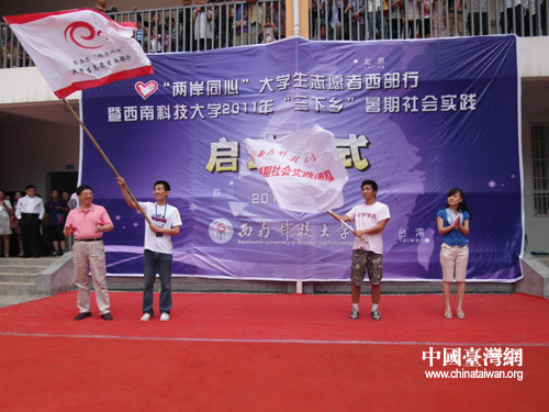 綿陽市臺辦主任陳福林、共青團綿陽市委黨組成員任彤梅共同為第五屆“兩岸同心”大學生志愿者西部行和“西南科技大學2011年暑期社會實踐赴游仙區團隊”授旗。