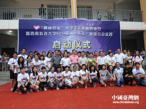 中國臺灣網7月12日綿陽消息 日前,由綿陽市臺辦、共青團西南科技大學團委、清華大學港澳臺事務辦公室、西南科技大學港澳臺事務辦公室、游仙區劉家鎮黨委政府共同主辦的第五屆“兩岸同心”大學生志愿者西部行暨西南科技大學2011年“三下鄉”暑期社會實踐活動在四川綿陽劉家鎮小學正式拉開帷幕。來自臺灣新竹清華大學、臺灣師范大學、臺灣大學、成功大學以及清華大學(北京)、中國美院和綿陽西南科技大學等40余名師生參加啟動儀式!