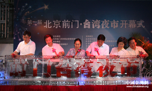 第一屆北京前門臺灣夜市昨日開幕,各界嘉賓為冰雕注入紅酒,寓意“紅紅火火”。(中國臺灣網(wǎng) 于斯文 攝)