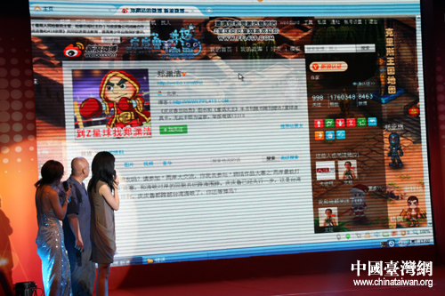 “童話大王”鄭淵潔出席“兩岸大交流—你我共參與”網絡作品大賽官網啟動儀式并現場發出微博,呼吁兩岸同胞通過網上互動,共同編織跨海“圍脖”。(中國臺灣網 王偉 攝)