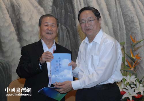 饒穎奇對上海市領導的熱情接待表示感謝,并向俞正聲贈送了自己編撰的圖書《兩岸和平·我心所愿》。