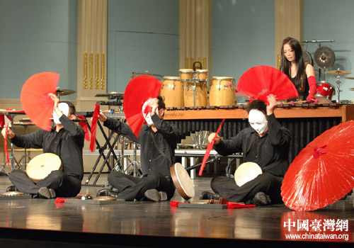 臺灣藝術家正在表演取材于臺灣少數民族神話的打擊樂《射日》。(圖片來源:上海市臺辦)