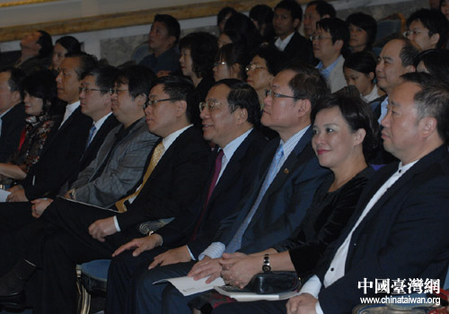 中共上海市委常委楊曉渡(前排右四)、中國國民黨大陸事務部主任高輝(前排右三)、上海市臺辦主任李文輝(前排右五)、上海市臺協會長李茂盛等和臺商們一起觀看演出。(圖片來源:上海市臺辦)